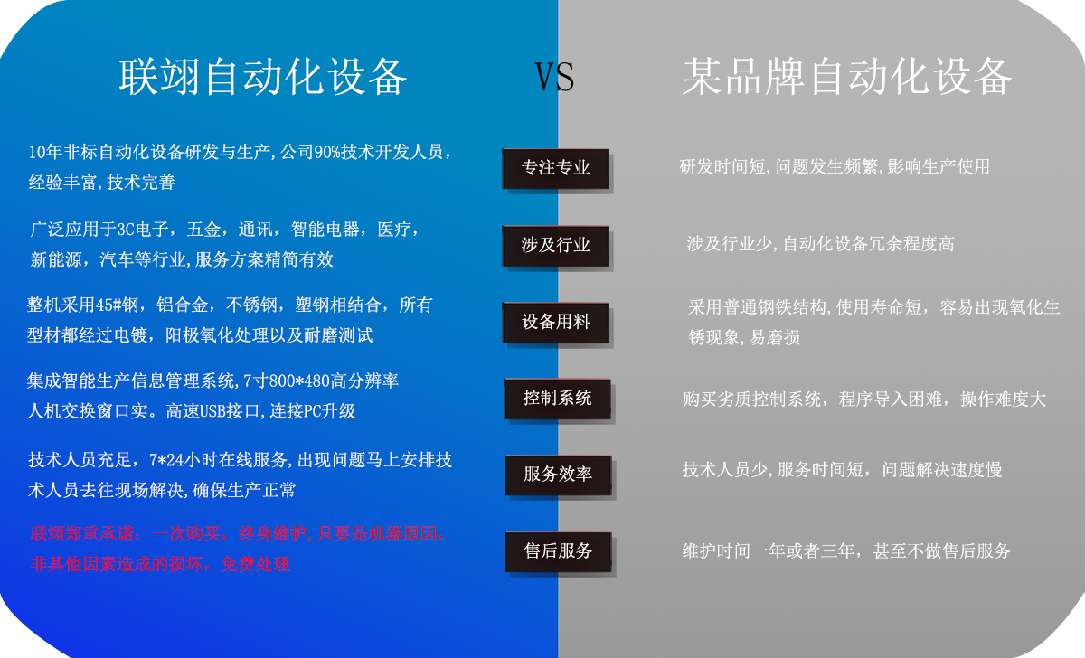 聯(lián)翊專注于助力企業(yè)邁向自動(dòng)化,減少人工成本,增加生產(chǎn)能力,提升行業(yè)競爭優(yōu)勢,從方案→設(shè)備→售后,一站式設(shè)備服務(wù)提供商,選擇聯(lián)翊,終身無憂。